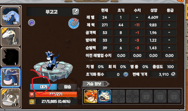 팁! 페트창에서 현재 전투 펫을 다른 펫으로 바꾸고 싶을 때 기존의 펫을 대기로 안 풀고 전투로 내고 싶은 펫을 대기 버튼을 클릭 하면 바로 전투로 바뀝니다.