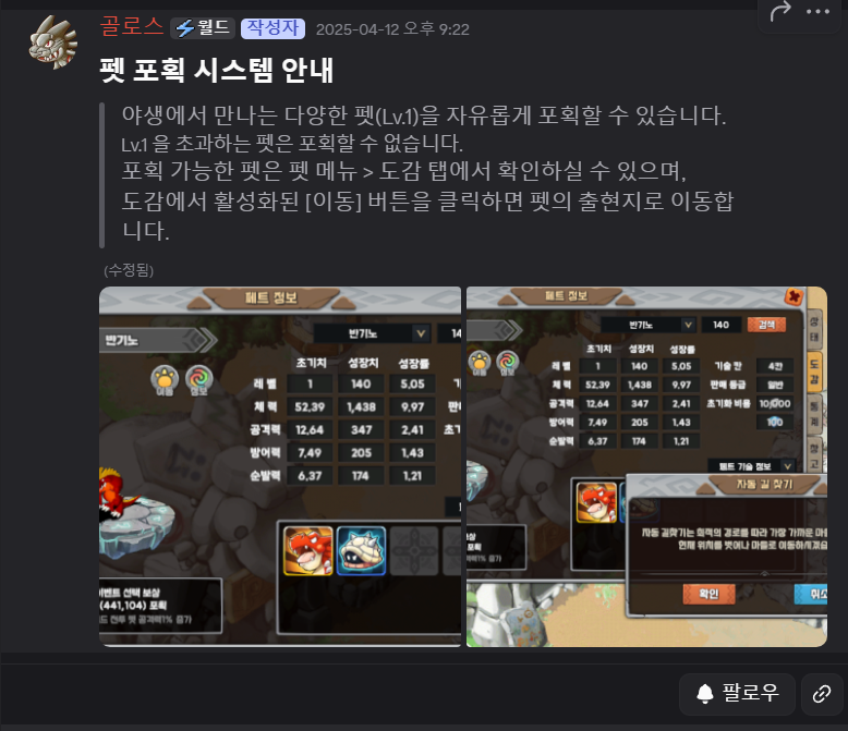 펫포획 시스템 및 펫포획해야 하는 퀘스트 정말 사소팁 봄나쪽지보내기 메일보내기 자기소개 아이디로 검색 전체게시물쪽지보내기 메일보내기 자기소개 아이디로 검색 전체게시물 25-12-01 00:15 669 1 13 목록 본문 여기저기 이미 플레이중이신 분들의 정보를 보면서 하고있는 뉴비입니다. 퀘스트를 깨며 루니 15레벨 잡으려 노력하다가 찾게 된 정보인데요 월드서버는 펫 레벨이 1인 펫만 포획이 가능하다는걸 알리고 싶어서 쓰게 되었습니다 추가로 레벨이 딱 맞지 않아도 클리어가 가능합니다 ! 루니 레벨 15이상베르가 30~49레벨상어류 25~34 레벨 예시입니다!정말 간단하지만 다음 유입되는 분들에게 도움이 될 것 같다면 추천한번씩 부탁드리겠습니다 ㅎㅎ 13 댓글목록1 박재승님의 댓글 박재승쪽지보내기 자기소개 아이디로 검색 전체게시물쪽지보내기 자기소개 아이디로 검색 전체게시물 25-12-01 22:21 우와 대박! 우와 대박!
