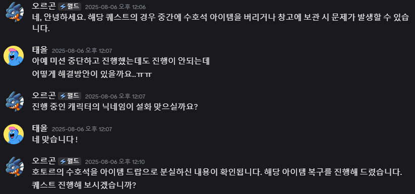 도난당한 수호석 퀘스트진행시 적토마쪽지보내기 메일보내기 자기소개 아이디로 검색 전체게시물쪽지보내기 메일보내기 자기소개 아이디로 검색 전체게시물 25-08-10 22:51 2,468 0 10 목록 본문 도난당한 수호석 퀘스트 진행시 수호석 분실 및 창고 보관시 오류가 생길수 있다고 합니다. 10 댓글목록0 등록된 댓글이 없습니다.
