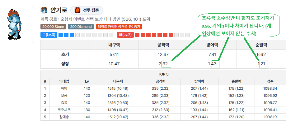 [공략] S급 페트 초기치 숫자에 속지 마세요. "소수점의 비밀" 정리 (얀기로 예시)
