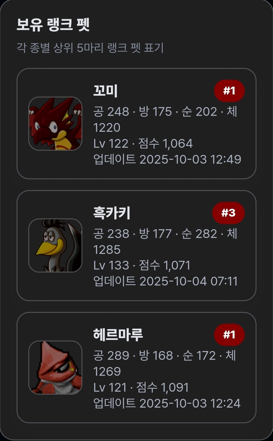 보유랭크펫!! 이민졍l쪽지보내기 메일보내기 자기소개 아이디로 검색 전체게시물쪽지보내기 메일보내기 자기소개 아이디로 검색 전체게시물 25-10-05 07:07 1,316 0 0 목록 본문 렙업좀해줘야겠구나.. 0 댓글목록0 등록된 댓글이 없습니다.