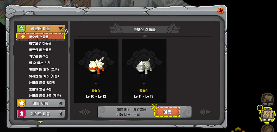 게임 화면 우측 하단 [위치 이동][사냥터 이동] 탭에서