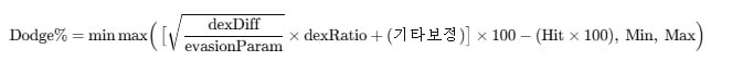 최종 회피율 = 기본 회피율 + 방어자 회피율 % − 공격자 명중률 %