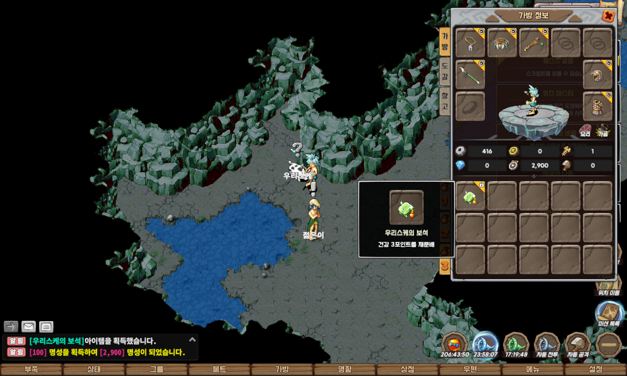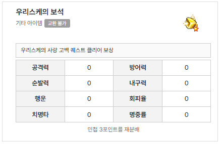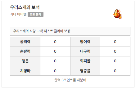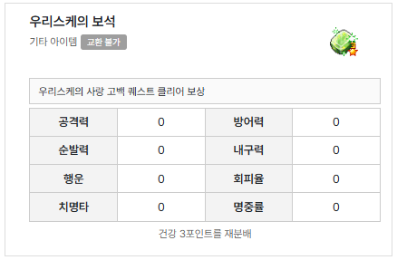 | 퀘스트 보상 | 우리스케의 보석 중 랜덤, 명성 100 |