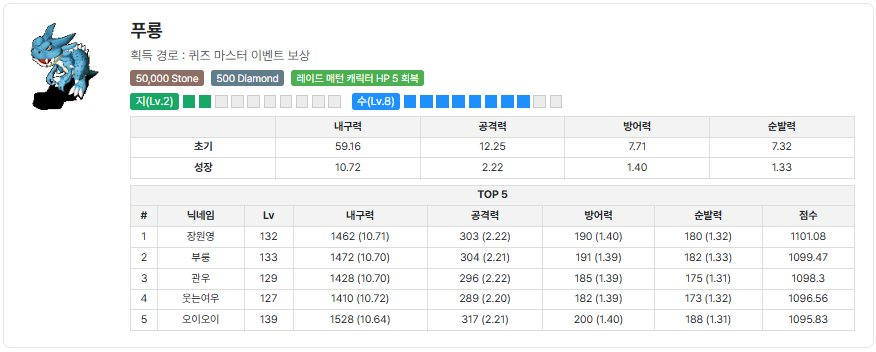 | 깡북이의 고기는 내구력 몇 전후 치료해 주는가? | 30 |