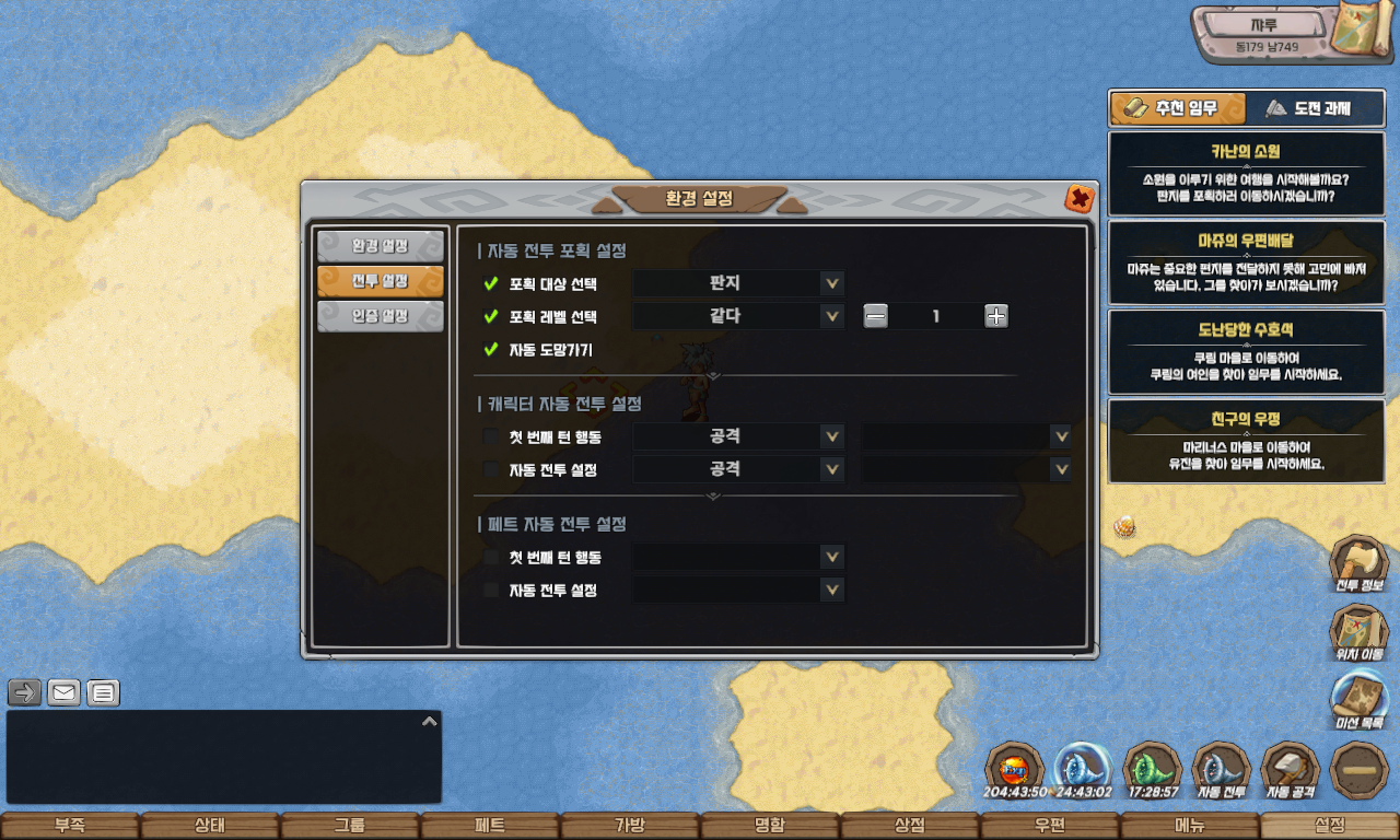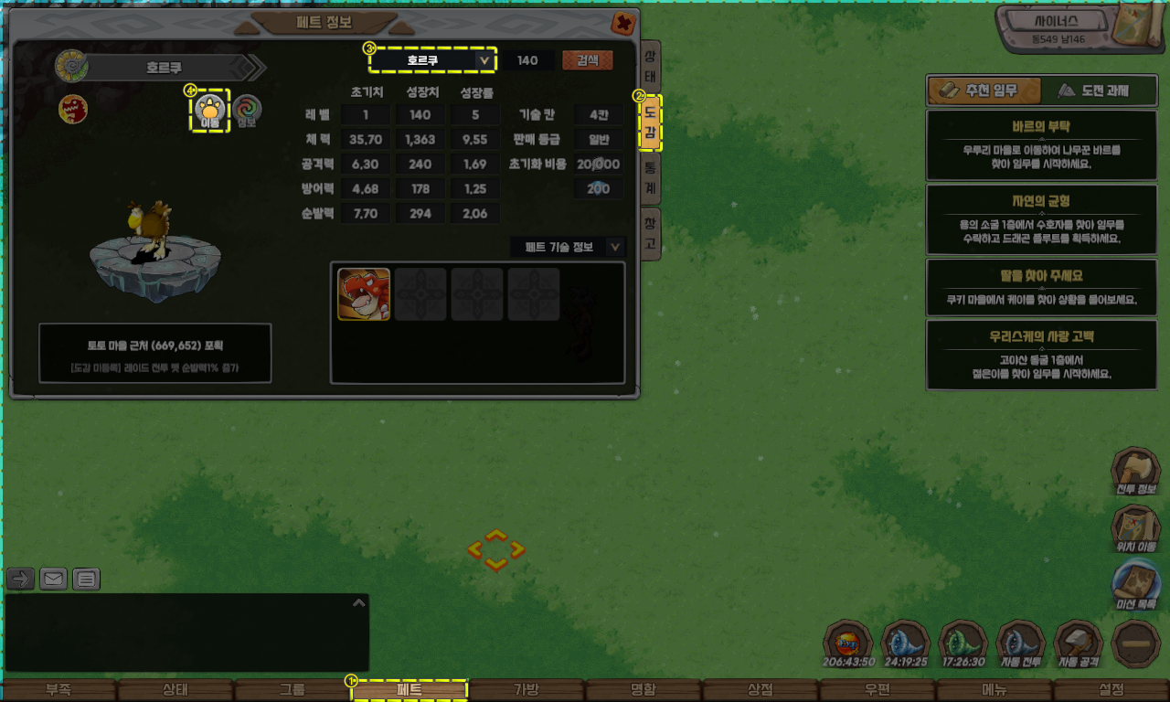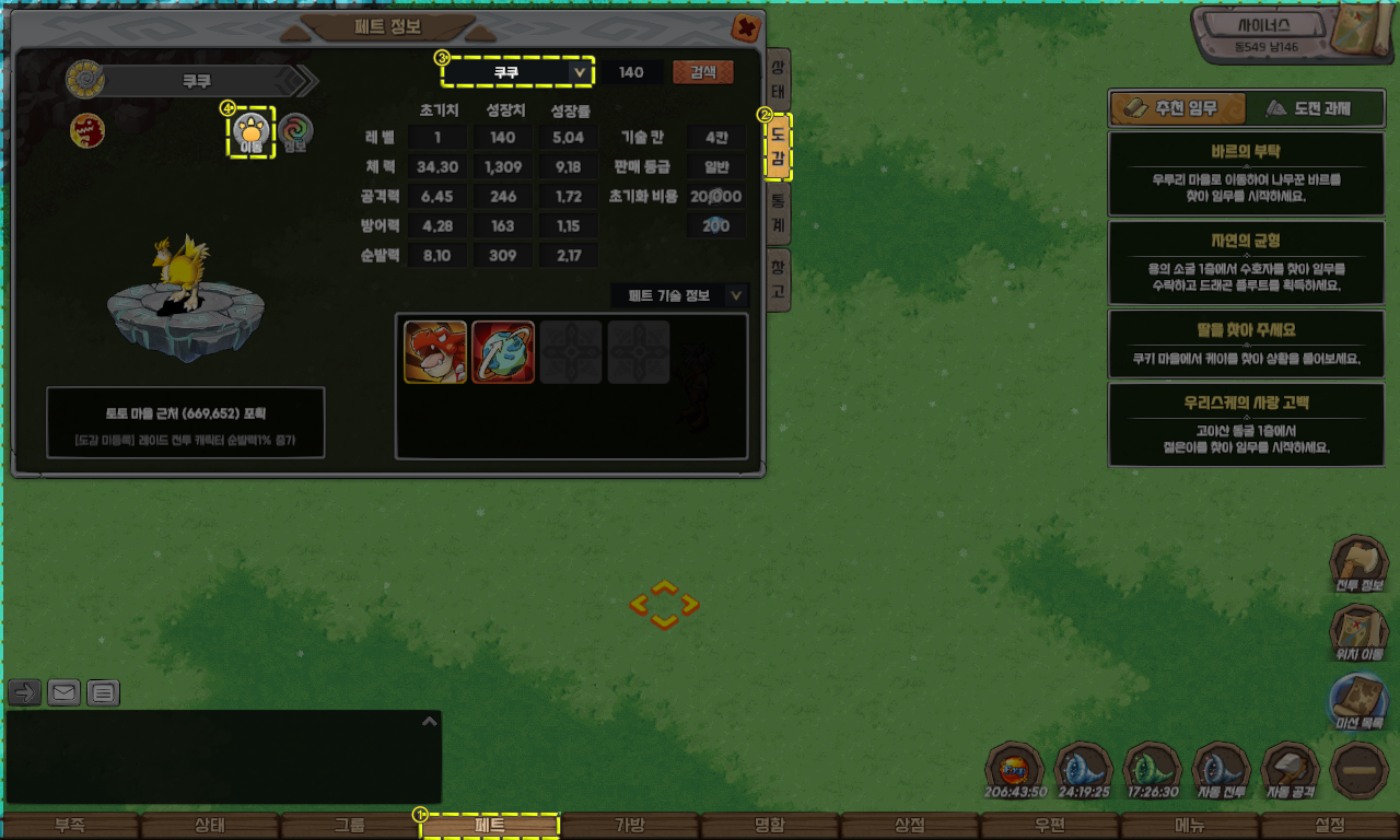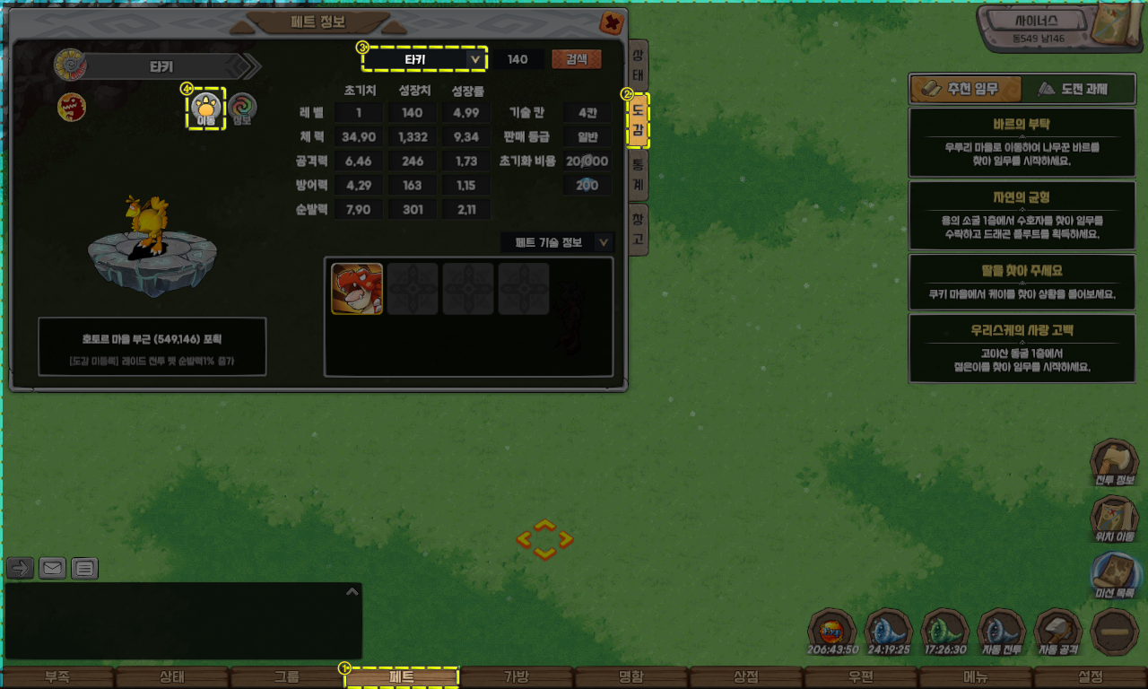 해당 퀘스트는 자동 이동 기능을 지원하지 않으므로, 펫 도감을 참고하여 아래의 펫을 직접 포획하셔야 합니다.