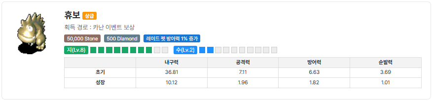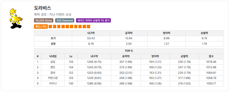 퀘스트 보상 펫 휴보, 펫 도라비스, 명성 500