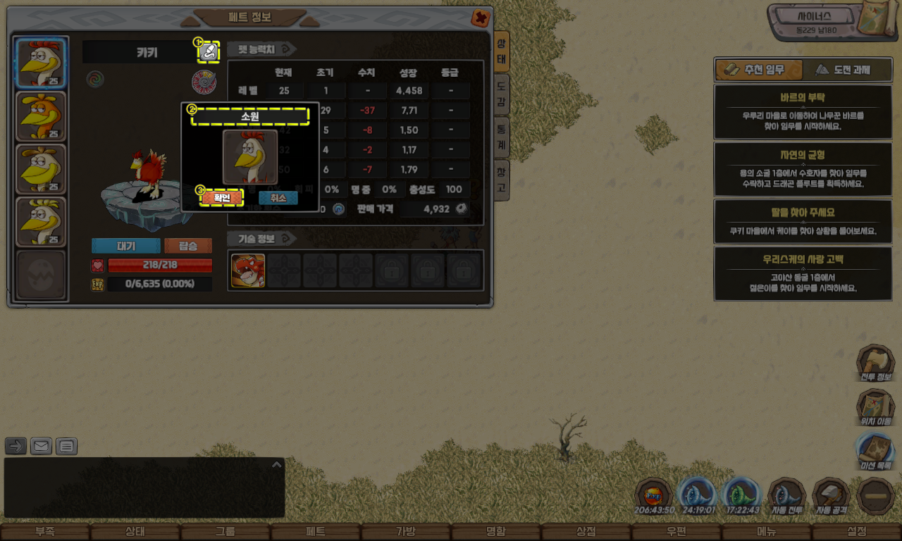 네 마리의 타조 펫을 Lv25 이상 Lv 35 미만 으로 육성하여 카난에게 전달해 주세요.