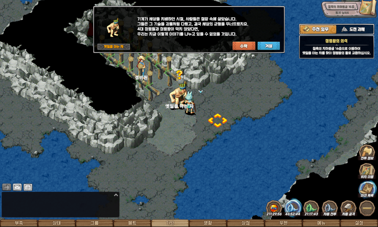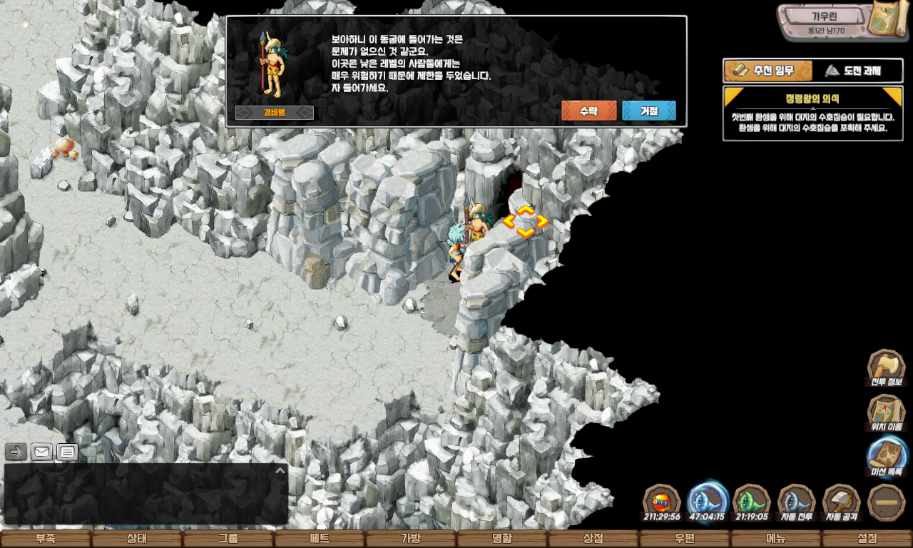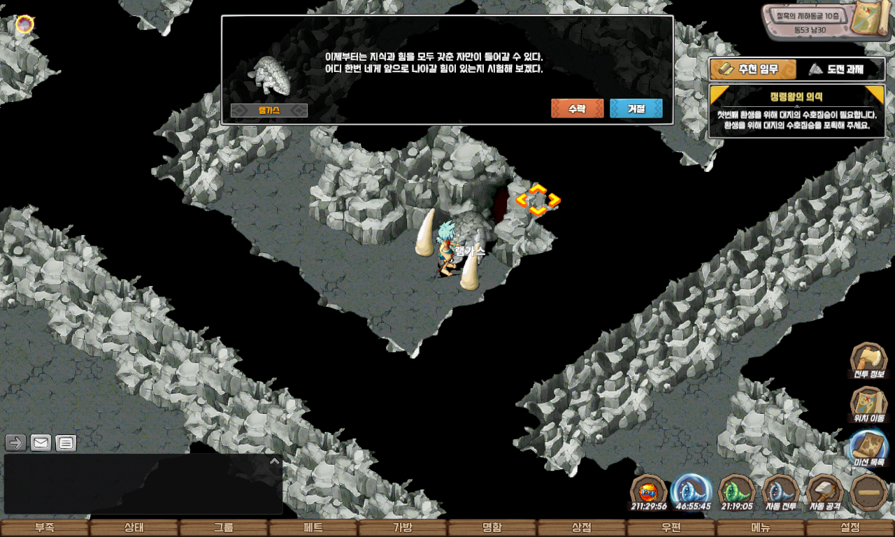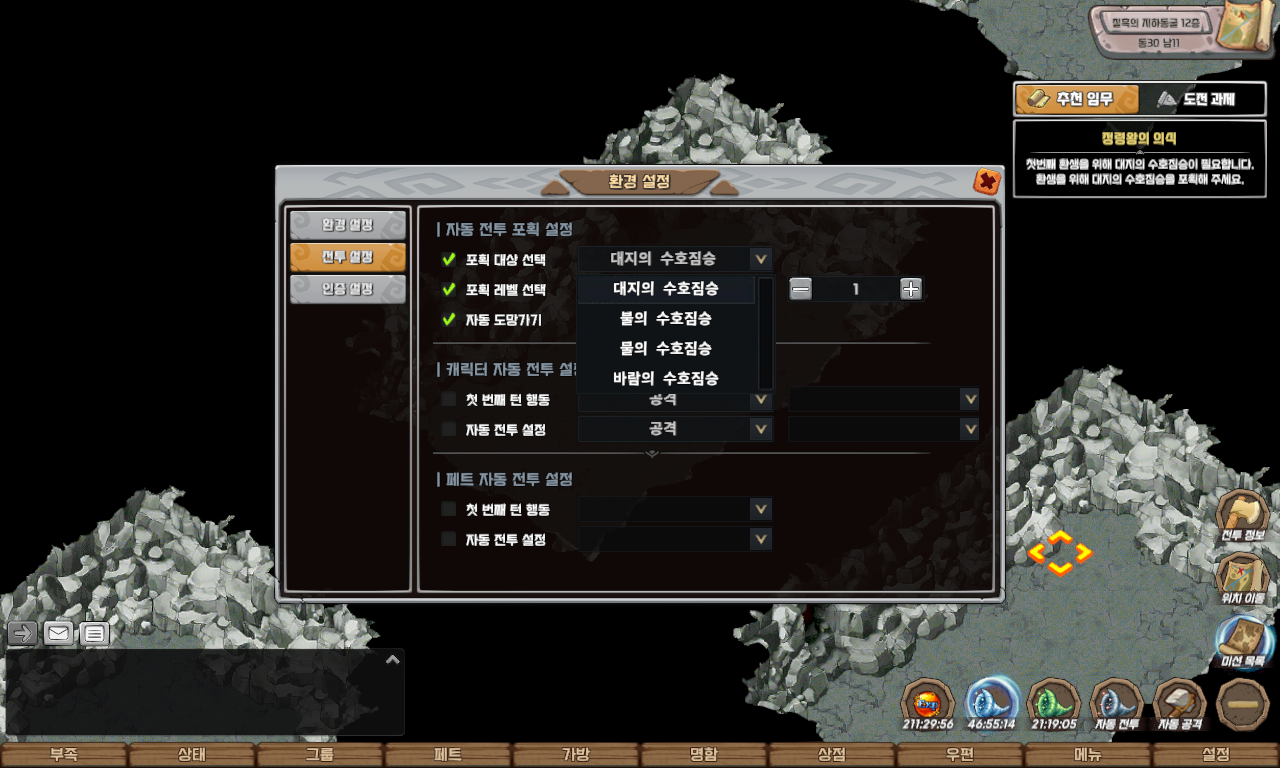 자동 길찾기를 이용하여 칠흑의 지하동굴 12층 동 30 남 11에 도착하면 일정 확률로 수호짐승들이 출현합니다.