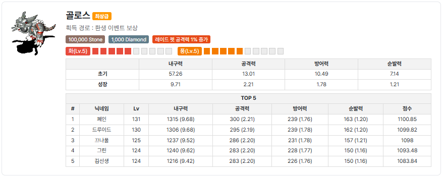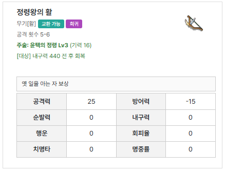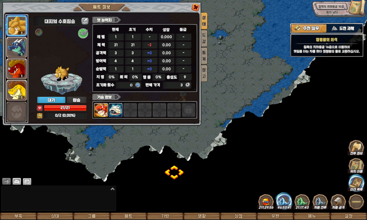 | 퀘스트 보상 | 정령왕의 활, 펫 환생얼룩우리, 카르곤, 투이, 메가로스, 골로스 |